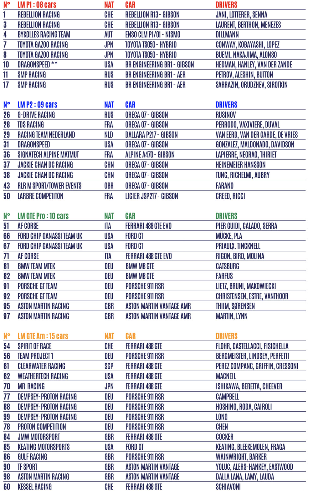 A equipe Racing Team Nederland é o único time da classe LMP2 que vai competir com um protótipo que não seja da Oreca. Os holandeses estarão alinhando o Dallara que competiu em 2018 em Le Mans e na ELMS. A G-Drive Racing e a RLR MSport receberam seus convites pelos títulos da classe Le Mans Series do ano passado.