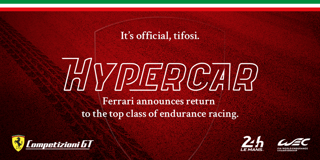 A marca italiana retornará ao endurance pela primeira vez desde 1973 e será mais um grande fabricante a confirmar sua participação na nova categoria Hypercar do WEC A Ferrari está pronta para enfrentar empresas como Toyota, Glickenhaus, Peugeot, Porsche e Audi, que se comprometeram com a categoria Hipercarro.