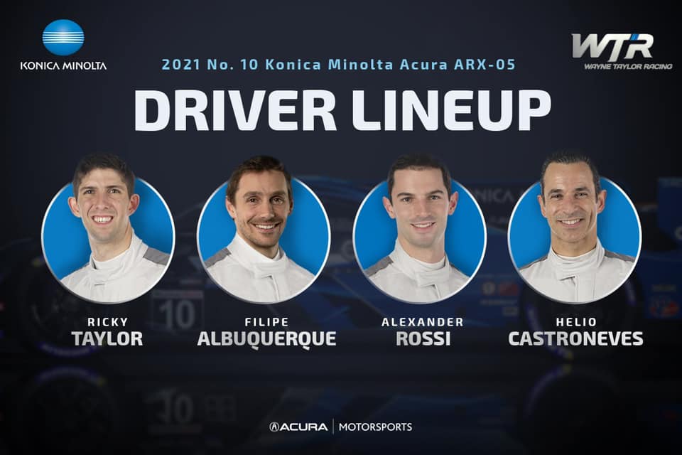 A equipe Wayne Taylor Racing confirmou nesta segunda-feira, 23, seus pilotos para a temporada 2021 da IMSA. A equipe trocará o Cadillac DPi pelo Acura ARX-05. Além do novo protótipo, a equipe escalou Ricky Taylor e Filipe Albuquerque para a temporada completa e Alexander Rossi e Helio Castroneves para as 24 Horas de Daytona