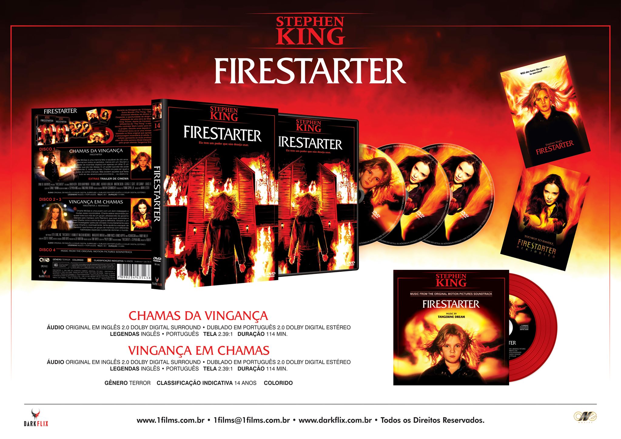 O DVD de Firestarter é do filme de 1984 que conta a história da pequena Charlene interpretada por Drew Barrymore. Filme é baseado no livro A Incendiária de 1981.