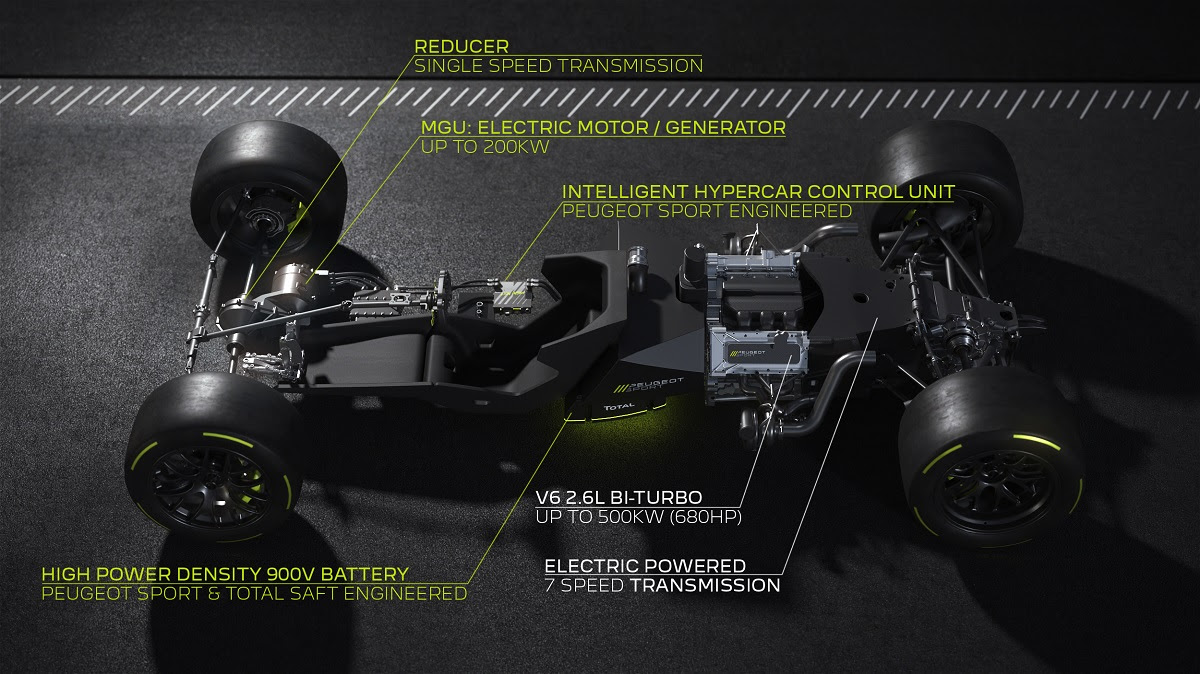 A Peugeot Sport divulgou nesta segunda-feira, 14, detalhes técnicos do seu Hypercar. O modelo terá um motor híbrido que desenvolverá 500kw. Além da potência, o protótipo contará com um motor a gasolina de 2,6 litros, 680 cavalos de potência), biturbo, V6, em conjunto com motor elétrico de 200 kW montado na frente.