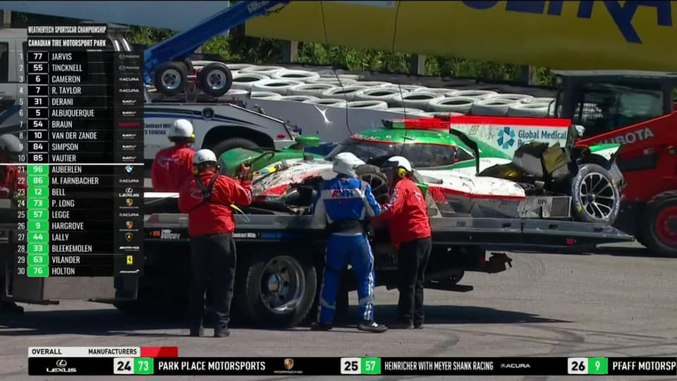 Faltavam 24 minutos para o término da prova quando o brasileiro, que pilota o Cadillac #50 da Juncos Racing com Will Owen, se chocou contra a barreira de pneus a aproximadamente 250 km/h.